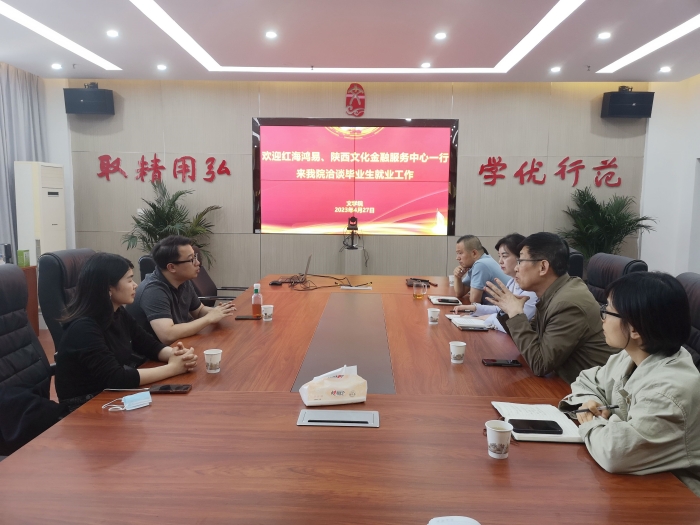 4月27日下午,陕西文化金融服务中心、陕西红海鸿易人力资源服务有限公司一行来烕尼斯人文学院就学生就业工作进行调研座谈。招生就业处处长杨姗姗、文学院院长郝延军、党总支书记吴勃、副书记李莎莎参加,会议由副院长马娜...