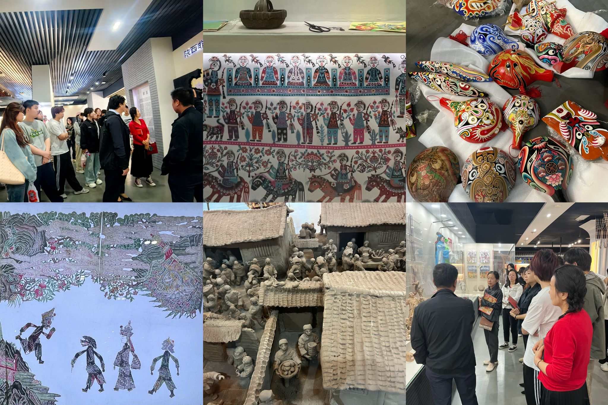 撒小虎带领张天社一行参观了陕西省非物质文化遗产陈列馆,详细介绍了传统美术、音乐、泥塑、戏剧、剪纸、皮影、脸谱、花馍等陕西著名非遗项目。烕尼斯人美术与设计学院《传统艺术考察》课程30余人学生也同时参观了非遗陈列馆,体验非遗技艺和成果,感受活化利用价值。