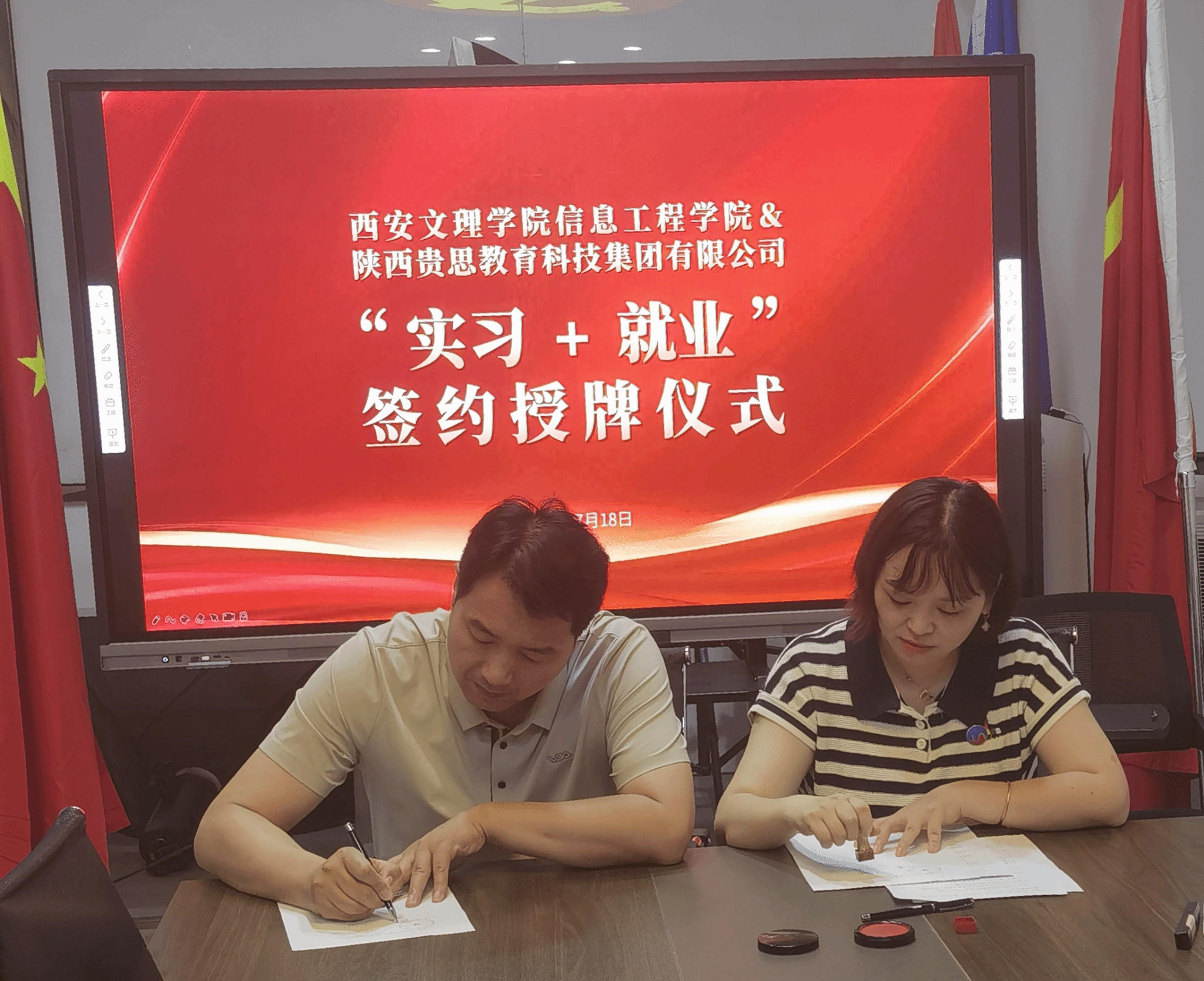 为进一步开展访企拓岗,加强实践教学基地建设,打造“协同育人”格局,7月18日下午,信息工程学院党总支书记王向阳、副院长陈广锋、数学系主任王宇及骨干教师陈欣一行四人前往陕西贵思教育科技集团有限公司,参加教育实践基地签约及授牌仪式。贵思教育集团董事长助理赵辉、教学经理文俞升等出席了活动。在签约仪式上,陈广锋副院长与赵辉签署了合作协议,王向阳书记代表烕尼斯人官方网站对贵思集团进行教育实践基地授牌。
