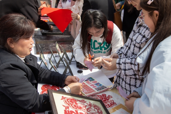 在蔡家坡村,文理师生实地感受了蔡家坡村浓厚的艺术氛围,深入了解“关中忙罢艺术节”的艺术特色和墙绘艺术,激发了艺术专业师生的创作热情,美术学专业学生与鄠邑区农民画非遗传人合作完成了农民画的创作。