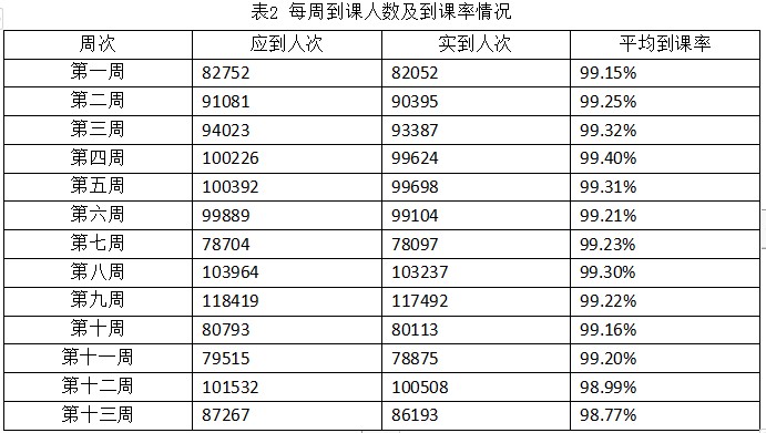 根据课程安排,应参加在线学习的学生9629人,其中第十三周应参加在线学习的学生87267人次,实际上课人数86193人次,平均到课率为98.77%。每周到课人数及到课率情况如表2所示。
