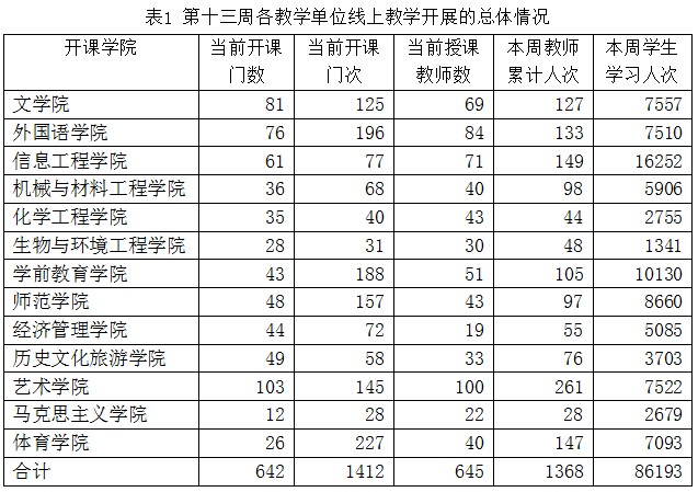 本学期全校教学计划安排947门课程,截止5月24日已开展线上教学的课程有823门(1683门次),占全部课程门数的86.91%,已有181门(271门次)课程已结课或理论部分已结课。第十三周授课教师645人,累计授课1368人次,开设线上课程1547班次。第十三周各教学单位线上教学开展的总体情况如表1所示。