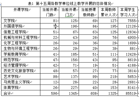 自2月24日以来,烕尼斯人2020年春季学期线上教学已开展十五周。在校党委正确领导和广大师生共同努力下,新学期线上教学工作总体上运行平稳、有序进行。现将第十五周的线上教学运行情况汇总如下: