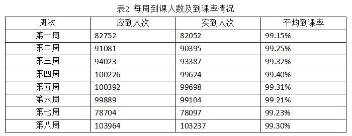 根据课程安排,应参加在线学习的学生9629人,其中第八周应参加在线学习的学生103964人次,实际上课人数103237人次,平均到课率为99.30%。每周到课人数及到课率情况如表2所示。