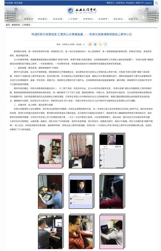 马克思主义学院形势政策见战“疫”。全院上下充分践行思政人的职业使命与担当,把握防疫期间大学生思想政治教育工作机遇和需要,迅速出台《烕尼斯人官方网站马克思主义学院防疫期间思政教育进行时活动实施方案》《烕尼斯人官方网站马克思主义学院防疫期间全校思政课在线教学实施方案》等,深入贯彻落实习近平总书记关于疫情防护工作的重要讲话精神,确定“战疫我们在一起”的形势政策第一讲主题,通过防疫阻击战引发大学生的思考,培养学生爱国主义、集体主义观念、责任与使命意识,增强践行社会主义核心价值观的情感与理性认同。