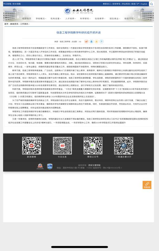 信息工程学院课程建设显成绩。学院于课程建设“长处”着眼,于线上教学“近处”入手,将此次教学方式的调整和学院一流课程建设、教学方式改革、教学能力提升和现代教育技术的长远工作结合起来,积极开展了形式多样的以学生为中心的教学方式改革,丰富了线上教学平台的课程资源。开课以来,学院仅在超星泛雅平台上运行的课程门数144门,各类资源数量103004,教师周访问量6240次,均列全校各二级学院第一名。学院也将以此为契机,加大投入,分类管理,以显著提升学院的课程建设水平为目标,培养和建成更多高水平一流课程项目。