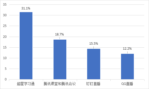 在最近一个月的线上教学运行中,513门次课程使用超星学习通授课,占总门次的31.1%;309门次课程使用腾讯课堂和腾讯会议,占总门次的18.7%;257门次课程使用钉钉直播,占总门次的15.5%;201门次课程使用QQ群直播,占总门次的12.2%;174门次课程使用智慧树,占总门次的10.5 %;另有198门次课程使用微信群、U校园、中国大学MOOC以及其他平台,占总门次的12.0%。