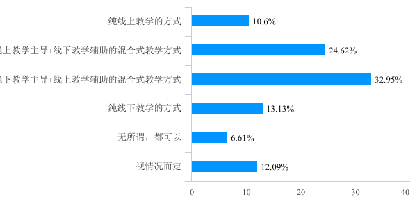 (二)在线教学方式认可度显著提升。对疫情结束后,更愿意选择的教学方式的选择上,87%的学生表现出对线上教学的认同,其中57%明确表示更愿意选择线上与线下相结合的方式;对比线下教学效果,57%的学生认为线上学习效果不一定比线下学习效果差。学生学习体验好感度明显上升,对在线教学方式接受度和认可度有较大幅度上升。