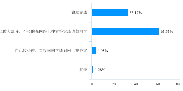 (三)学生自主学习意识和能力显著提升。74%的学生认识到自主学习能力及习惯对在线学习效果的影响较大,70%的学生每个线上学时对应的线下自主学习时间在2个小时以上,94%的学生对于教师布置的在线学习作业,大部分能够独立完成;76%的学生能够主动回答教师问题或主动向教师提问。数据显示,针对第一轮调查后反映出的学生自主学习能力较差问题,在第二阶段的线上教学中得到了较好的改善,学生自主学习意识和能力得到有效培养。