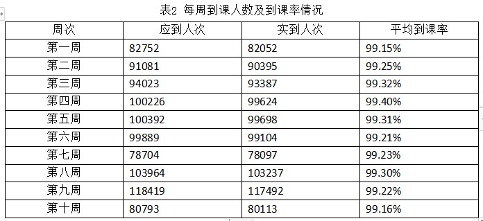 根据课程安排,应参加在线学习的学生9629人,其中第十周应参加在线学习的学生80793人次,实际上课人数80113人次,平均到课率为99.16%。每周到课人数及到课率情况如表2所示。