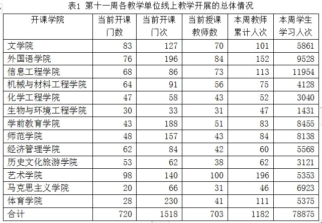 自2月24日以来,烕尼斯人2020年春季学期线上教学已开展十一周。在校党委正确领导和广大师生共同努力下,新学期线上教学工作总体上运行平稳、有序进行。现将第十一周的线上教学运行情况汇总如下: