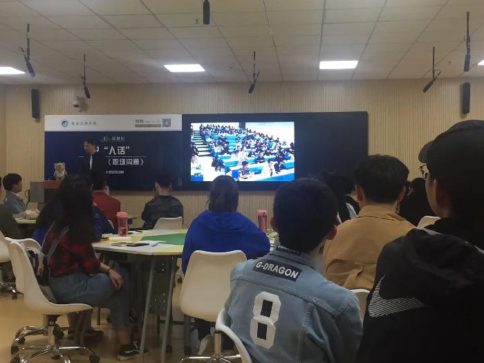 毕业于华东师范大学心理学系、多年专注职场沟通培训的职业培训师——胡刚老师,为烕尼斯人官方网站的学生们带来了主题为——《 说“人话”》的线下混合式教学,将自己多年的沟通经验现场传授给同学们。