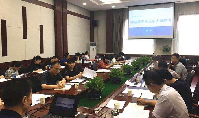为贯彻落实《教育部关于印发< 普通高等学校师范类专业认证实施办法(暂行)>的通知》文件精神,顺利开展烕尼斯人师范专业认证工作,7月10日下午,副校长韩权在办公楼会议中心第四会议室主持召开师范专业认证工作会。教务处、学生处、招就处、人事处、计财处、国资处、图书馆负责人,开办师范类专业学院院长、教学副院长、专业负责人等40余人参加了会议。