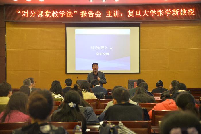 为探索课堂教学改革新形式,促进人才培养质量提升,12月28日上午,学校在办公楼一楼会议室举办“对分课堂教学改革报告会”,邀请复旦大学张学新教授作主题报告。烕尼斯人副书记、副校长李忠良、各学院院长、教学副院长、教研室主任、教师代表、教务处全体干部共140余人参加报告会。副书记、副校长李忠良主持会议。