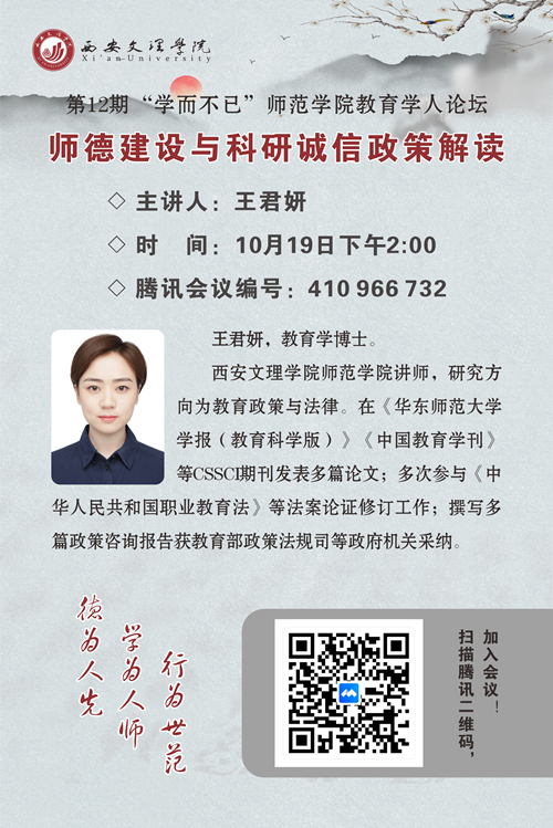 王君妍,教育学博士,烕尼斯人官方网站师范学院讲师,研究方向为教育政策与法律。在《华东师范大学学报(教育科学版)》《中国教育学刊》等权威期刊发表多篇论文;多次参与《中华人民共和国学前教育法(草案)》《中华人民共和国职业教育法》《陕西省家庭教育促进条例(草案)》等法案论证修订工作;撰写多篇政策咨询报告获教育部政策法规司等部门采纳。