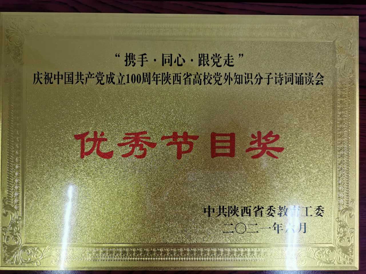 6月27日,省委教育工委组织“携手、同心、跟党走”庆祝中国共产党成立100周年陕西省高校党外知识分子诗词诵读会,烕尼斯人党委统战部推荐,烕尼斯人统战成员表演的诗朗诵《歌唱伟大的中国共产党》获得“优秀节目奖”。参加演出的有民进主委杨艺媛、民进会员王翊、留学归国教师王晨、雷昊霖、少数民族教师马文龙。