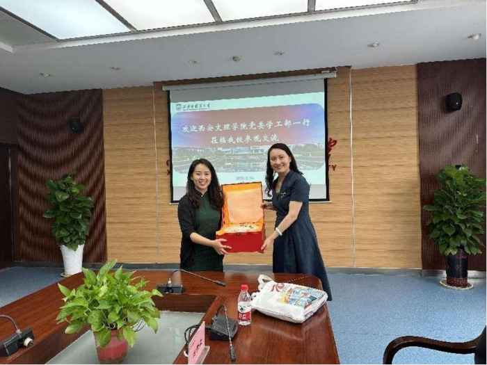 西安外国语大学学工部部长丁铭带领学工团队热情接待了郑旻一行,并就外国语大学“一站式”社区建设的总体建设情况做了整体介绍。随后,西安外国语大学学工部副部长梁鹿儿做了题为《坚持立德树人 打造“三全育人”新高地》的专题分享,分别从顶层设计、党建引领、队伍配备、凸显实效、强化保障五个方面详实介绍了从“六位一体”思政进公寓育人体系到“一站式”学生社区综合管理模式的建设沿革。郑旻对外国语大学学工团队的热情接待,和知无不言、言无不尽的交流分享表示感谢,并指出:西安外国语大学在推进“一站式”学生社区建设方面积累了丰富的有益经验,对烕尼斯人推进落实“一站式”学生社区综合管理模式建设提供了新的思路和积极的借鉴。