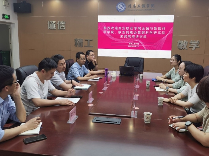 6月14日上午,西安欧亚学院金融与数据科学学院副院长申亚琛,数据科学与大数据技术专业负责人姚香秀,狗熊会数据科学研究院项目研发总监常莹、王璇等一行四人来信息工程学院座谈交流,学院副院长陈广锋、大数据教研室主任许迅雷及教师刘光军,陈霖及师范学院教师闫成海等人参加座谈。