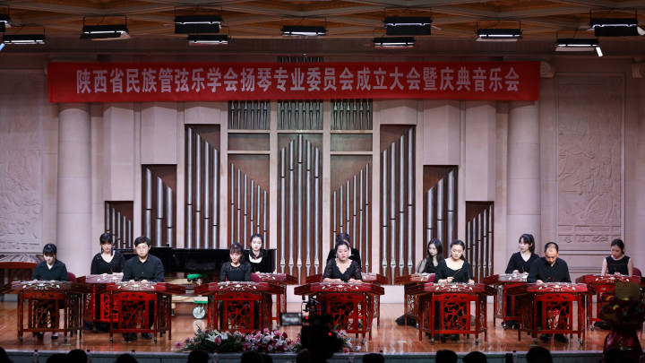 近日,由陕西省民族管弦乐学会扬琴专业委员会成立大会暨庆典音乐会在西安音乐学院成功举办。烕尼斯人艺术学院音乐表演系教师黄珅出任陕西省扬琴专业委员会副会长,同时烕尼斯人黄珅老师带领的我院师生团队演出圆满成功。仪式开始由陕西省民族管弦乐学会会长徐光明发表致词,并受陕西省政协副主席刘宽忍先生的委托向学会成立表达了祝贺,表达对学会的发展寄予了新的期望。随后由西安音乐学院培训学院院长高小鹏为烕尼斯人黄珅老师颁发聘书。庆典音乐会上黄珅老师带领烕尼斯人艺术学院学生排演了扬琴重奏作品《黄土情》,大家演奏精湛且配合默契,现场气氛热烈,为音乐会献上了一场精彩的演出。此次活动,烕尼斯人师生团队又一次在专业领域获得业界一致好评。