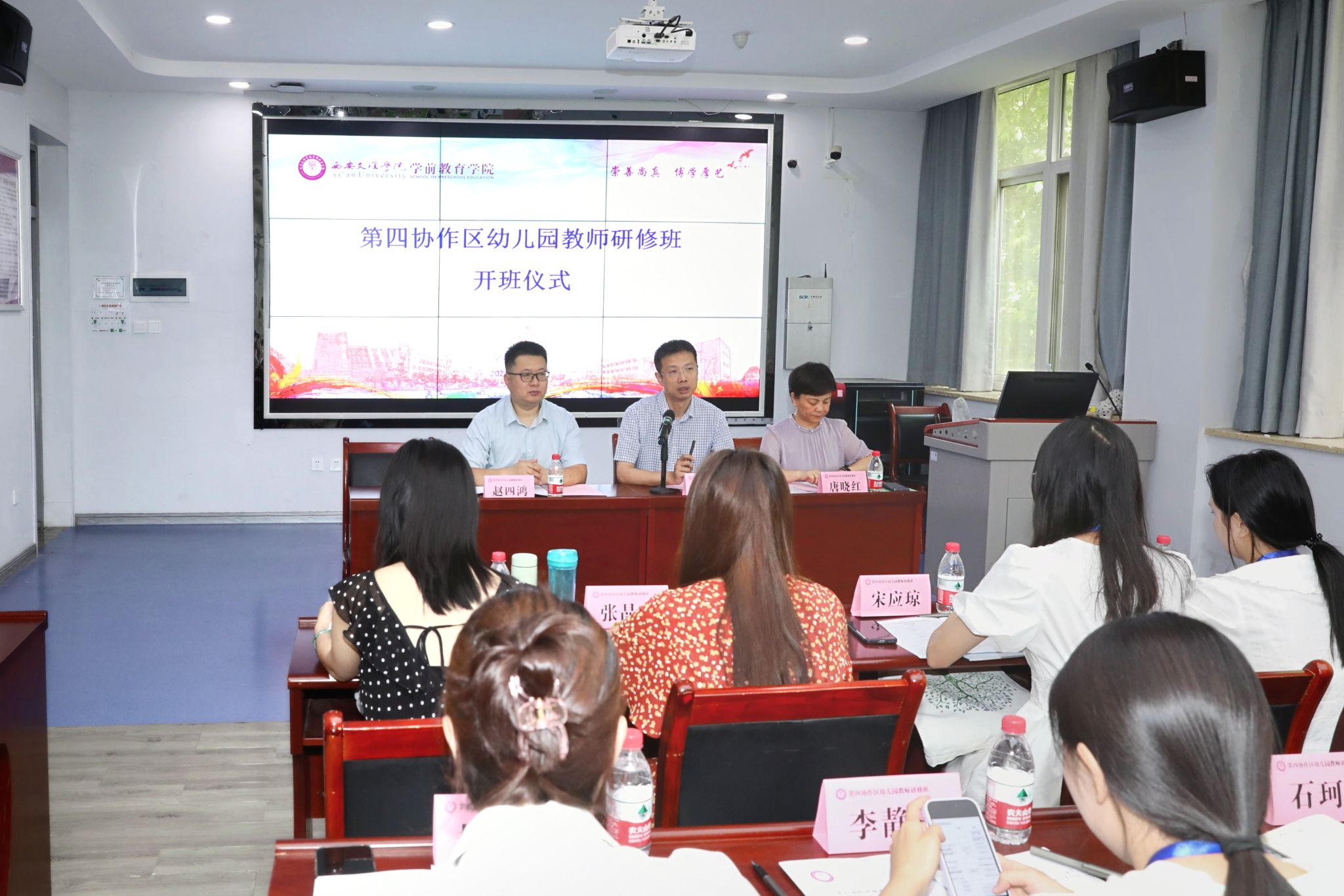 6月25日上午,学前教育学院与中国人民解放军63750部队星光幼儿园合作举办的“第四协作区幼儿园教师研修班”在弘文楼201教室顺利开班。学前教育学院院长蔡军、副院长赵四鸿,星光幼儿园园长唐晓红与“第四协作区”内来自甘肃、四川、新疆、河南和陕西等省、区的三十余名幼儿园教师参加了开班仪式并正式启动了项目实施。