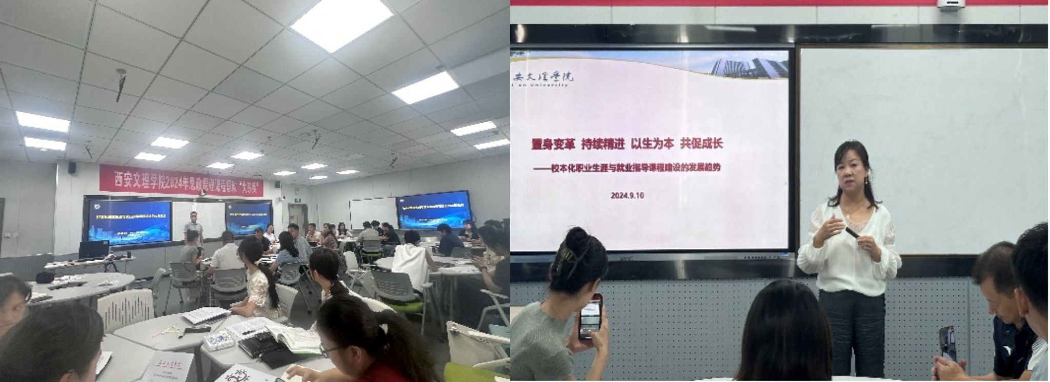 学生职业生涯发展教育中心主任冯宁从生涯教育的发展、课程设置、生涯特色工作室建设等方面分享了暑期外出学习心得,围绕生涯教育始终服务于高校人才培养,分享了首都师范大学、南京航空航天大学、北京航空航天大学等学校生涯教育课程建设设置及工作室建设情况。之后现身说法,分享生涯教育教学方法,通过分小组团辅活动,带领现场老师们完成生涯唤醒活动。现场气氛热烈,老师们均表示获益匪浅。