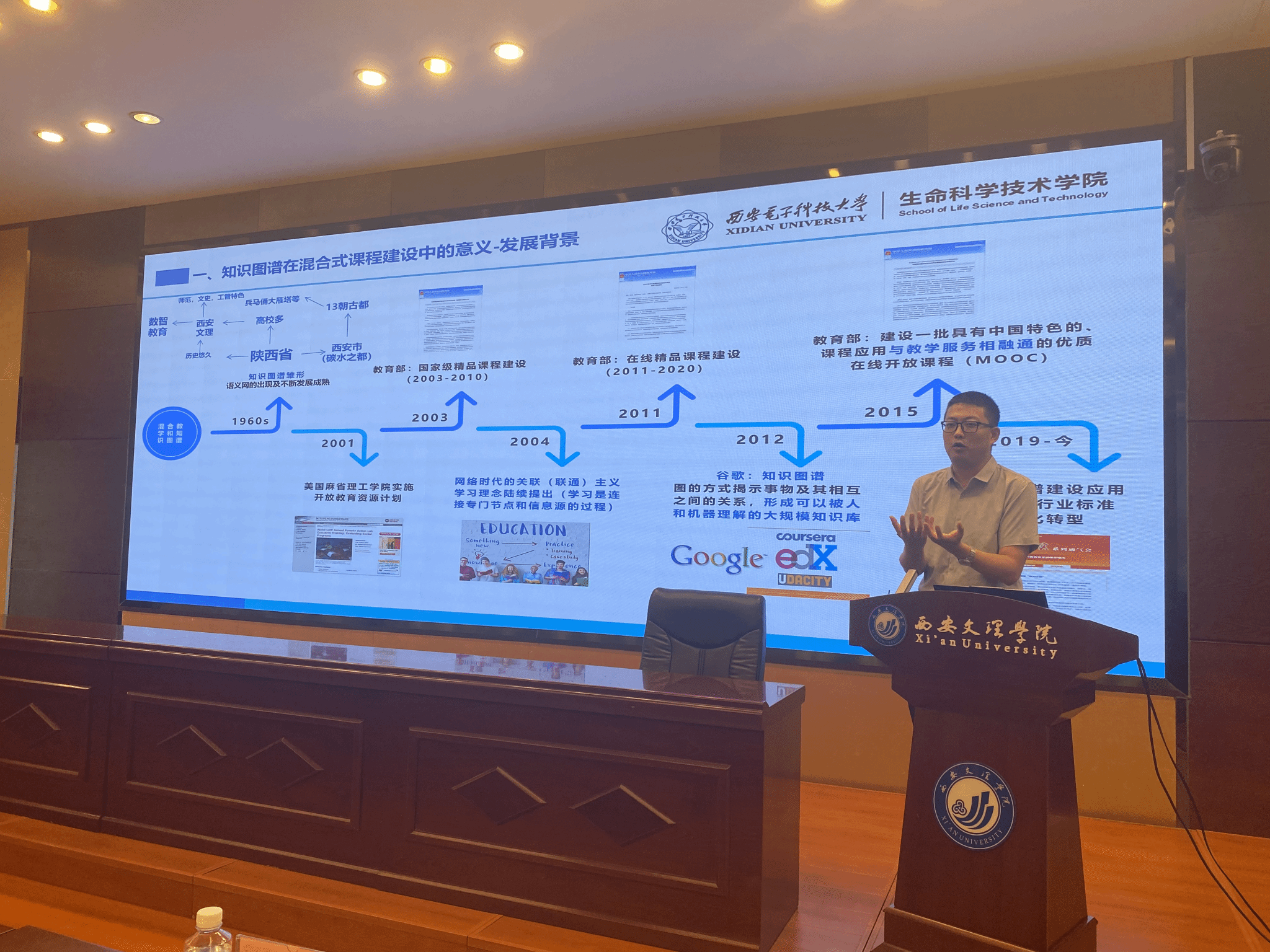唐飞作了主题为《知识图谱/AI助教赋能教学创新》的报告,主要介绍了以知识图谱概念为基座,融入人工智能和数字人在课程中的应用,构建“资源-知识-问题-能力”的课程思维模型,探索混合式教学设计的做法。他以其所教授的《电气工程基础》课程为例,通过数据分析表明混合式教学模式进一步增强了学生的体验感,提升了学习的热情和内驱动力,提高了课堂效率,并在学科竞赛等方面取得了良好成效。