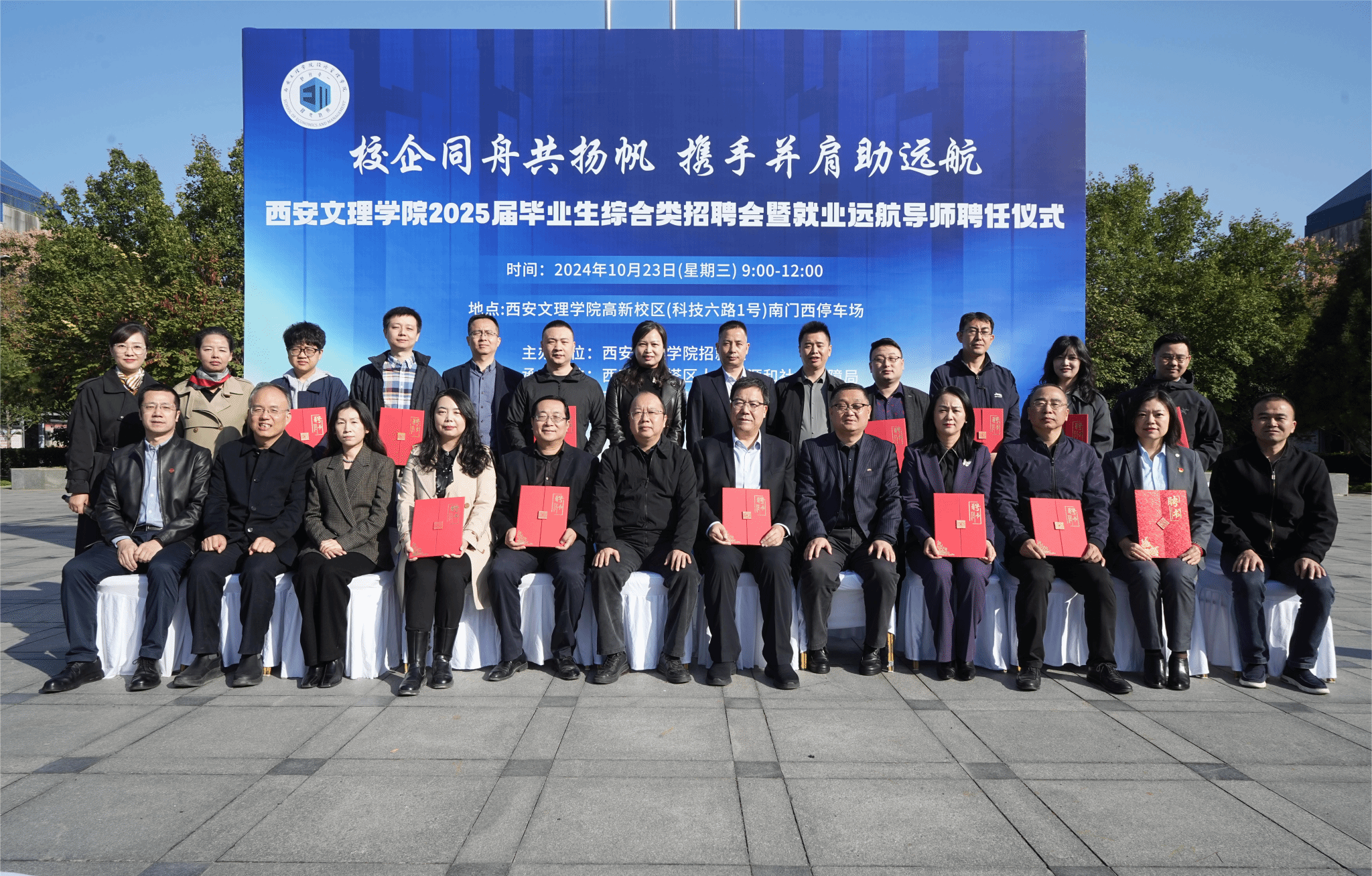 招聘会前,经济管理学院在校南门广场举办就业远航导师聘任仪式,聘任行业精英担任就业远航导师,充分发挥导师的朋辈帮扶与榜样引领作用,携手助力学生成长。仪式上,学院党总支书记陈沛致欢迎词;院长闫荣国宣读聘任决定;招生就业处处长李小勇、学生工作部副部长张亚环、教务处副处长张云哲、经济管理学院院长闫荣国为17位行业精英及对口帮扶我院的党委组织部、培训中心负责人颁发就业远航导师聘书;陕西尚华会计师事务所副总经理李文元作为导师代表表态发言;会计学2203班代阳阳代表学生致谢发言;校党委委员、副校长刘明利总结讲话并对深化校企合作提出殷切期待,希望经济管理学院充分发掘资源,通过开放式办学不断促进校企合作开花结果,不断提升学院服务地方经济社会发展的能力和水平。