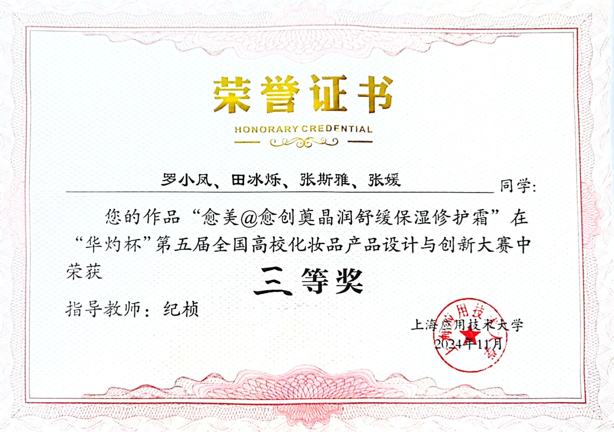 化学工程学院化学工程与工艺专业学生罗小凤、田冰烁、张斯雅、张媛等四名同学表现出色,斩获三等奖1项,这也是烕尼斯人首次在该项赛事中获奖,充分展现了烕尼斯人在化妆品产品设计与创新领域的突破性发展。