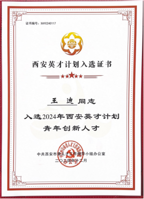 近日,根据陕西省科学技术厅发布的《陕西省科学技术厅关于组织推选2024年中青年科技创新领军人才、科技创新创业人才及2025年陕西省青年科技新星的通知》(陕科人才函〔2024〕349号),以及市委组织部(市委人才办)发布的《“西安英才计划”实施办法》《“西安英才计划”青年人才项目实施办法》,烕尼斯人机械与材料工程学院王迪博士入选2025年度陕西省青年科技新星及2024年“西安英才计划”青年创新人才。