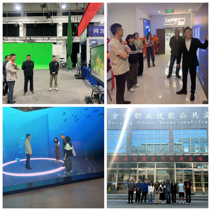 北京电影学院视听传媒学院副院长赵丹介绍了专业设置、AI技术在教学及学生创作参赛经验;在i艺数考察了XR电影内容生产与展映;首钢工学院计算机与媒体艺术学院安晏辉院长引导参观了VR虚拟仿真实训室、穹幕影院及电影动作数字采集基地,并安排烕尼斯人戏剧影视文学专业七名学生进行为期一周的AI影像制作及数字化直播学习。最后,各方就专业联动、协同育人、专业数智化建设达成合作共识。