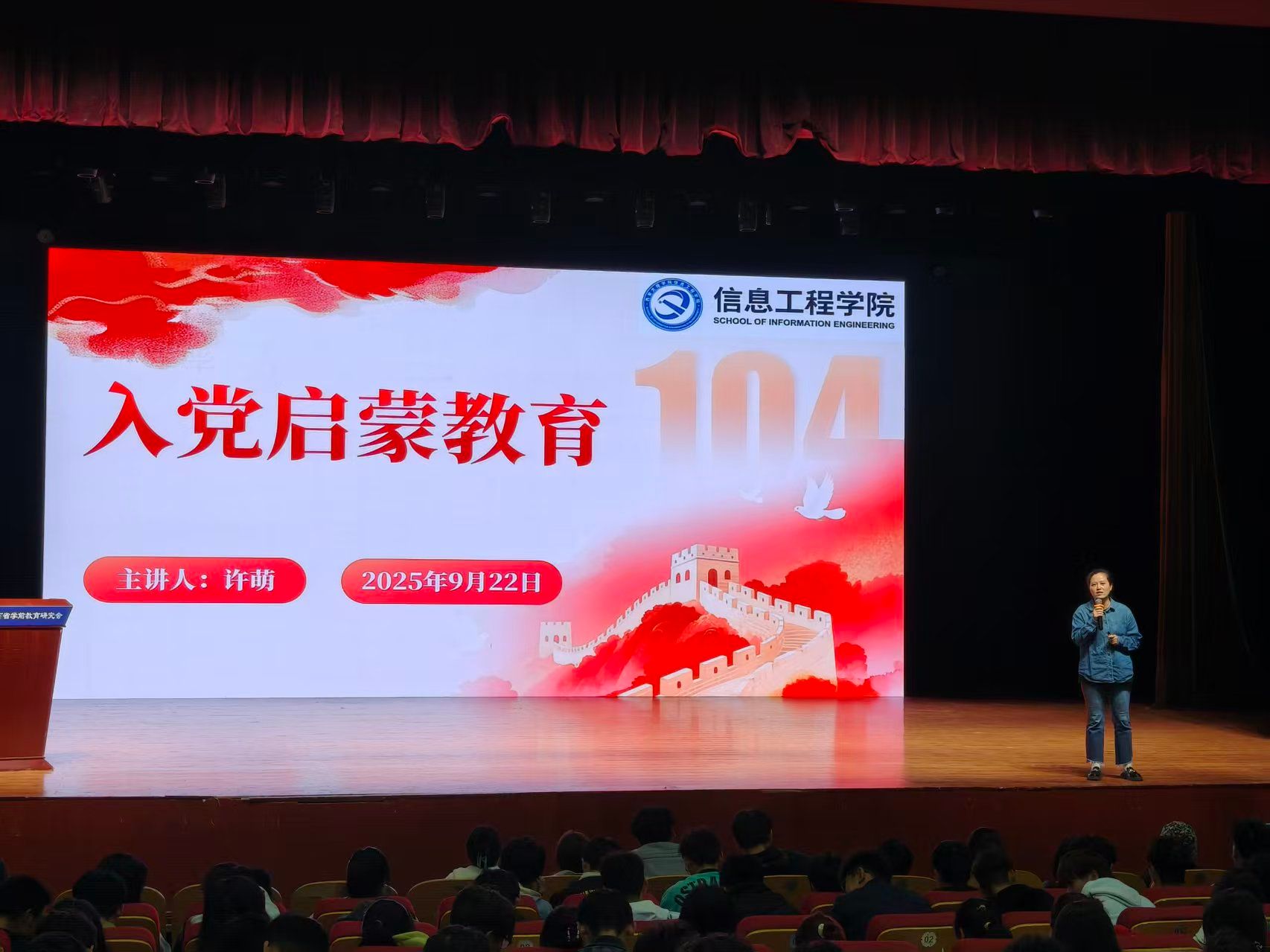 为引导新生扣好“人生第一粒扣子”,筑牢青年学子理想信念,9月22日,信息工程学院在大礼堂成功开展2025级新生入党启蒙教育。本次入党启蒙教育由党总支副书记许萌主讲,学院党总支书记王向阳、党建专责老师张亚茹,25级新生辅导员任钰嘉、毕冉以及全体2025级新生参加。
