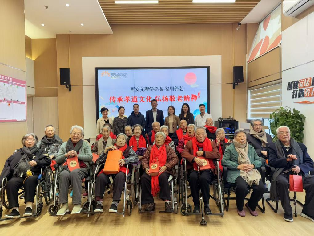 西安安居养老服务产业有限公司董事长马玉科与经济管理学院党总支书记陈沛进行致辞。音乐学院献唱《夕阳红》,文学院表演手势舞《感恩的心》,经济管理学院演绎秦腔选段。师生们为老人佩戴红围巾,赠送棉袜和手制香囊,老人们回赠手工艺品。马玉科董事长为学校授予“优秀志愿者组织”牌匾。