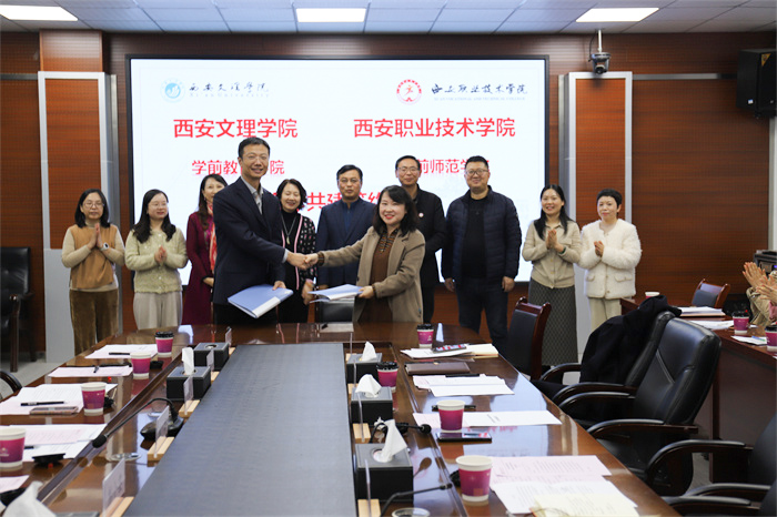 1月12日下午,学前教育学院与西安职业技术学院学前师范学院签署《合作共建备忘录》。西安职业技术学院党委委员、副院长袁卫敏、学前师范学院副院长肖鑫鑫、党总支书记黄文波,烕尼斯人官方网站教务处处长、学前教育学院院长蔡军、党总支书记刘爱霞等领导班子全体成员及双方教师代表参加签约仪式。