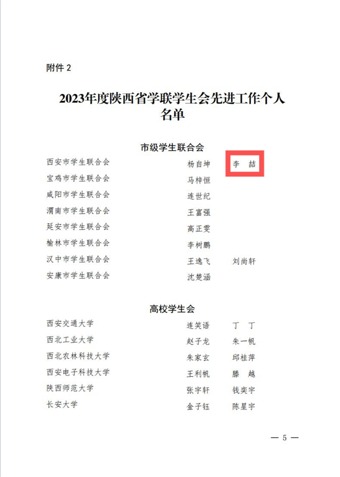 近日、陕西省学生联合会印发《关于2023年度陕西学联学生会组织工作述职评议结果的通报》,烕尼斯人2020级信息工程学院学生、西安市学生联合会主席李喆;2021级马克思主义学院学生、校学生主席团成员张小雨荣获“2023年度陕西省学联学生会先进工作个人”。