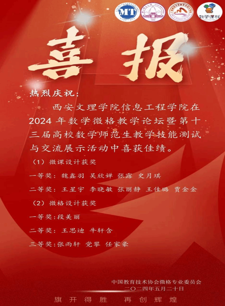 5月17日至20日,由中国教育技术协会微格教学专业委员会主办的第十三届高校数学师范生教学技能测试与交流展示活动在广西师范大学举办。烕尼斯人信息工程学院数学与应用数学专业10名学生在“微格教学技能测试”中斩获一等奖1项、二等奖2项和三等奖3项,在“微课设计能力测试”中斩获一、二等奖各2项,学校获“优秀组织单位”荣誉称号。