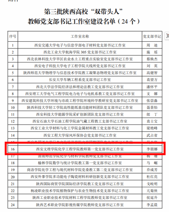 近日,中共陕西省委教育工委公布了第三批陕西省高校“双带头人”教师党支部书记工作室培育创建名单,遴选建设全省高校24个“双带头人”教师党支部书记工作室,烕尼斯人化学工程学院教师第一党支部书记工作室成功获批立项,这也是烕尼斯人首个省级“双带头人”工作室。
