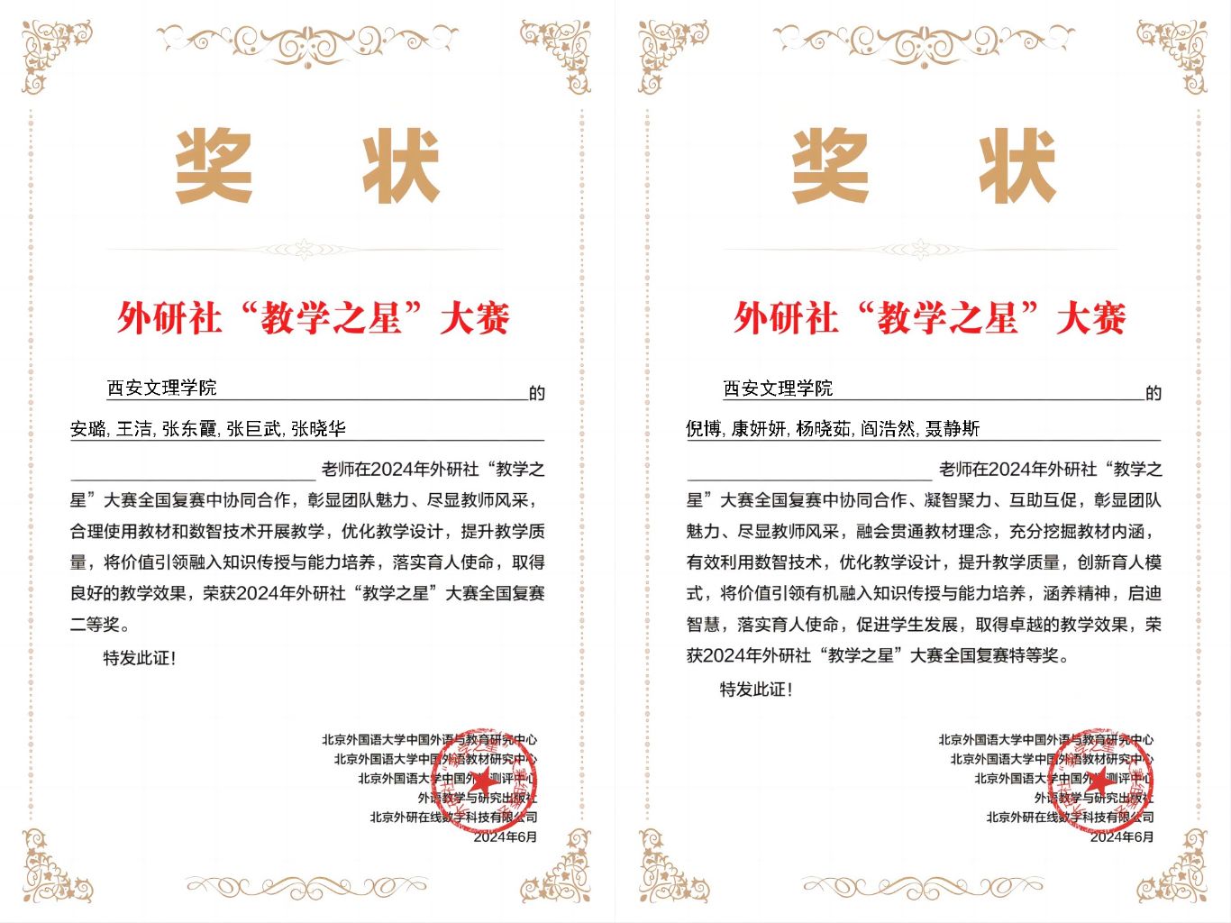 6月20日,由北京外国语大学中国外语与教育研究中心、外语教学与研究出版社主办的2024外研社 “教学之星”大赛(本科英语组)全国半决赛晋级名单公布。烕尼斯人外国语学院英语类专业组团队(倪博、康妍妍、杨晓茹、阎浩然、聂静斯)荣获全国复赛特等奖,并作为陕西唯一的英语类专业组代表队晋级全国半决赛,实现了烕尼斯人在该赛事上零的突破;同时,大学英语组团队(安璐、王洁、张东霞、张巨武、张晓华)荣获全国复赛二等奖。