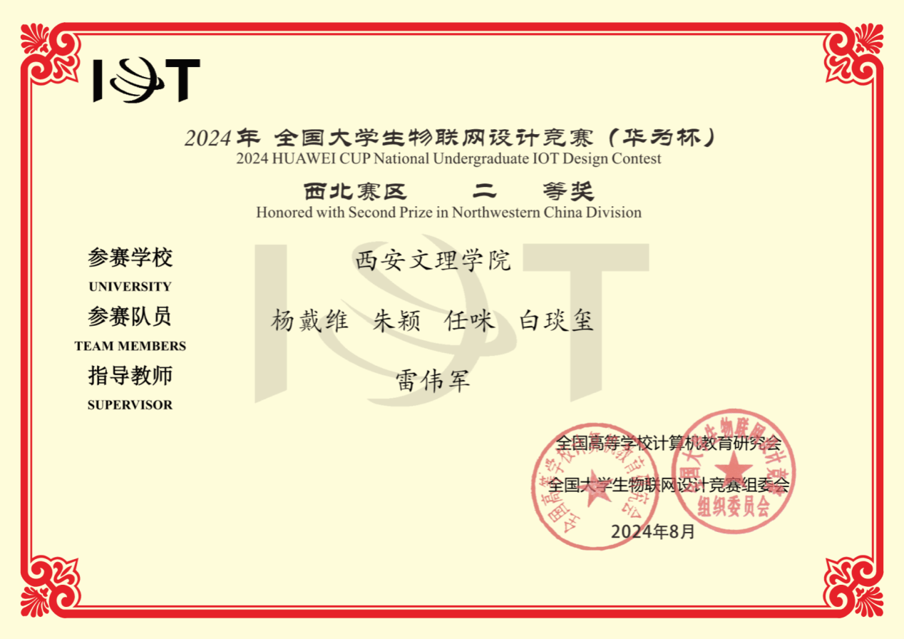 8月16日,2024年全国大学生物联网设计竞赛西北赛区决赛在郑州大学举行。烕尼斯人信息工程学院参赛团队(队员:杨戴维,朱颖,任咪,白琰玺,指导教师:雷伟军)提交的作品《基于多传感器的公园游船安全多方式报警系统》荣获西北赛区二等奖。作品采用多传感器融合信息感知与监测控制,实现船载和手机钉钉两种联合实时报警功能。