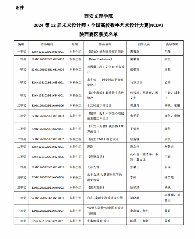 近日,在第十二届全国高校数字艺术大赛中,烕尼斯人美术与设计学院师生凭借出色的创意和卓越的设计能力,斩获全国总决赛奖项3个和陕西赛区奖项17个的优异成绩。