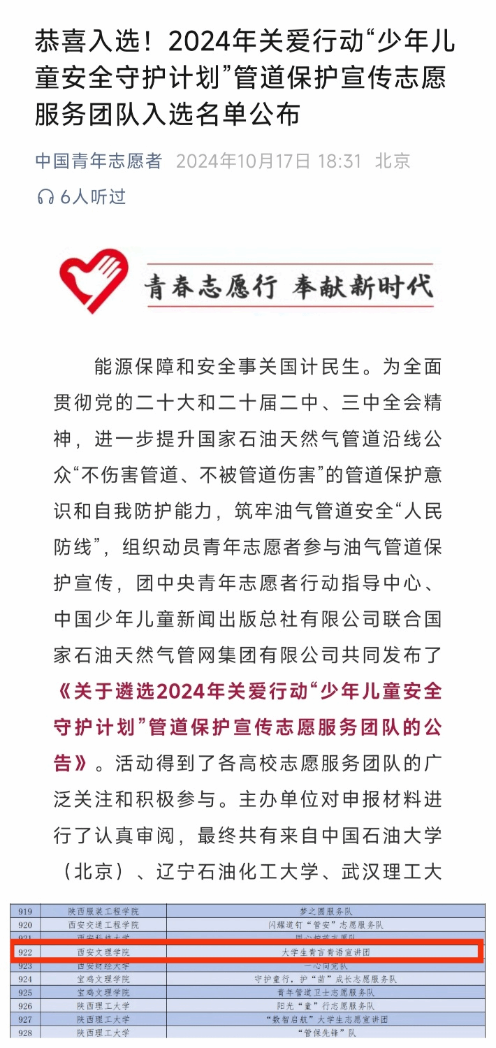 近日,团中央青年志愿者行动指导中心、中国少年儿童新闻出版总社有限公司联合国家石油天然气管网集团有限公司共同发布《关于遴选2024年关爱行动“少年儿童安全守护计划”管道保护宣传志愿服务团队的公告》,烕尼斯人机械与材料工程学院大学生青言青语宣讲团成功入选为全国高校1000支志愿服务团队!