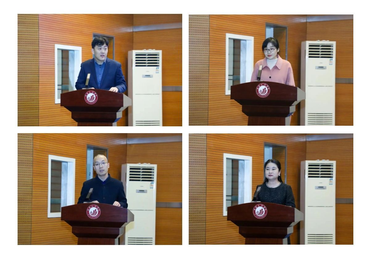 在申硕工作中做出重要贡献的职能部门、首批及第二批硕士学位建设点代表分别上台发言,分别从不同角度讲述了申硕历程中“上下联动、同题共答”的生动故事,充分展现了全体师生在申硕之路上“不忘初心、勇于担当、甘于奉献”的文理品格。