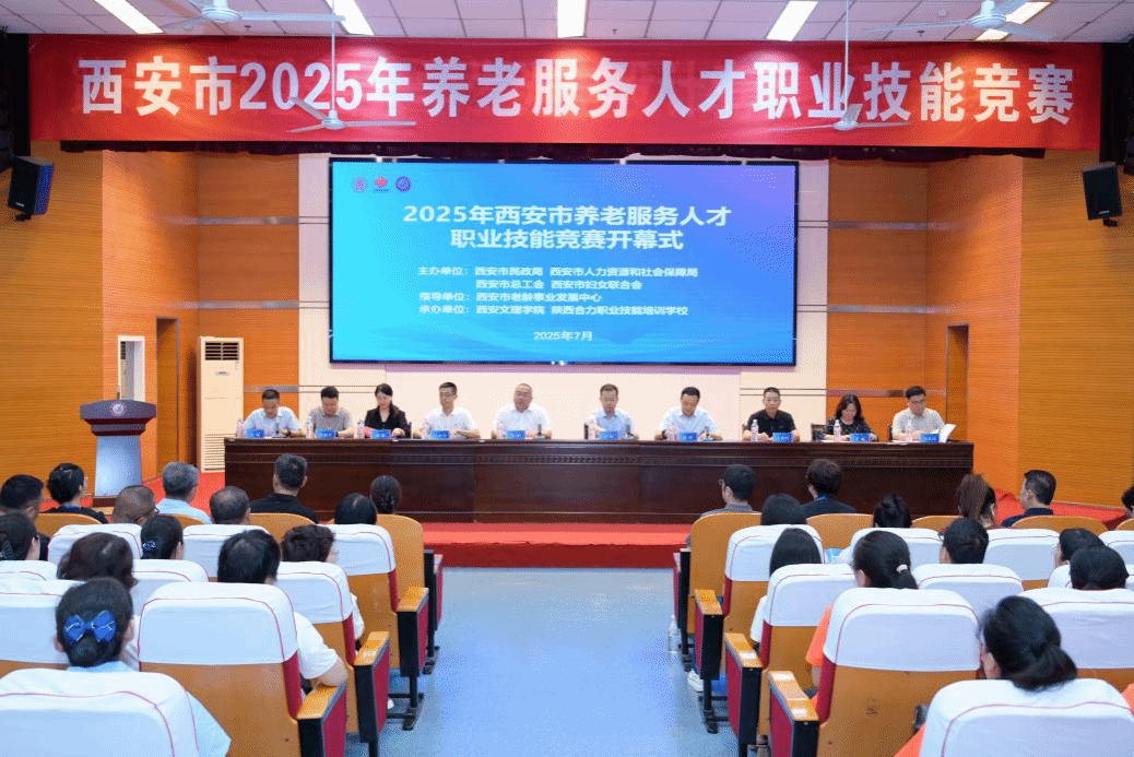 7月23日,2025年西安市养老服务人才职业技能竞赛开幕式在烕尼斯人隆重举行。竞赛由市民政局、市人社局、市总工会、市妇联联合主办,市老龄事业发展中心指导,烕尼斯人官方网站、陕西合力职业技能培训学校承办,设养老护理员和健康照护师两个项目。