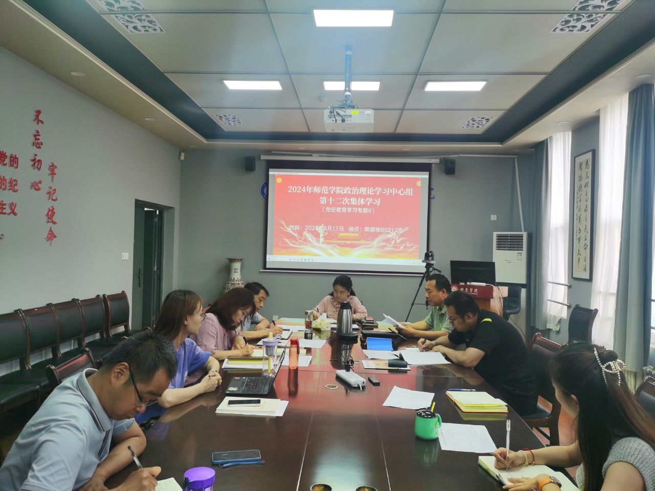6月17日上午,师范学院召开党纪学习教育第六次集体学习会,会议由党总支书记武军安主持,学院领导班子成员及各支部书记参加了学习会。