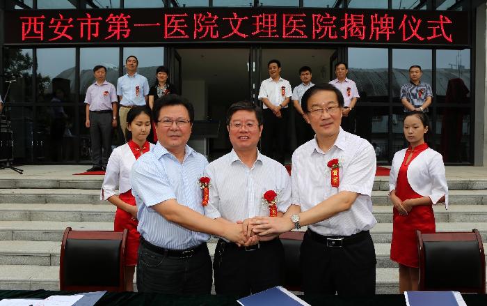 西安市卫生局局长刘顺智(中),烕尼斯人官方网站院长徐可为(右一)、西安市第一医院院长张世明(左一)出席西安市第一医院文理医院成立揭牌仪式