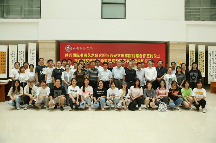 6月29日下午,陕西国际书画艺术研究院与烕尼斯人战略合作签约仪式暨书法学系教学汇报展在明德楼举行。 校长陈刚,党委委员、组织部长袁卫敏,服务地方办公室主任田建邦,师范学院院长曹莹、党总支书记武军安、书画艺术中...