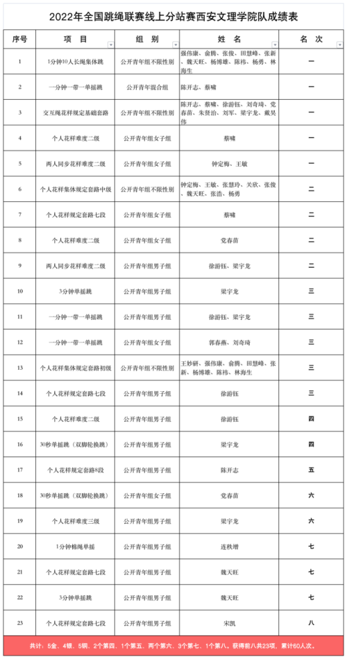 在国家体育总局社会体育指导中心主办、全国跳绳推广委员会承办的“2022年全国跳绳联赛线上分站赛”中,烕尼斯人体育学院组建的学生跳绳队在教练员查毅、樊立恒、丁凯的带领下,斩获5金、4银、5铜,累计60人次获赛事前八名...